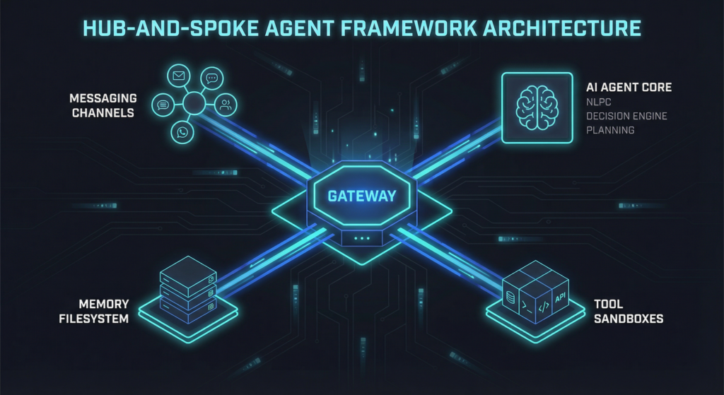 Yderst i systemet sidder en Gateway, som fungerer som ren trafikdirigent uden nogen form for intelligens. Den tager imod beskeder fra WhatsApp (via Baileys), Telegram (via grammY), Slack, Discord og iMessage — og normaliserer dem til ét fælles format, inden de sendes videre.